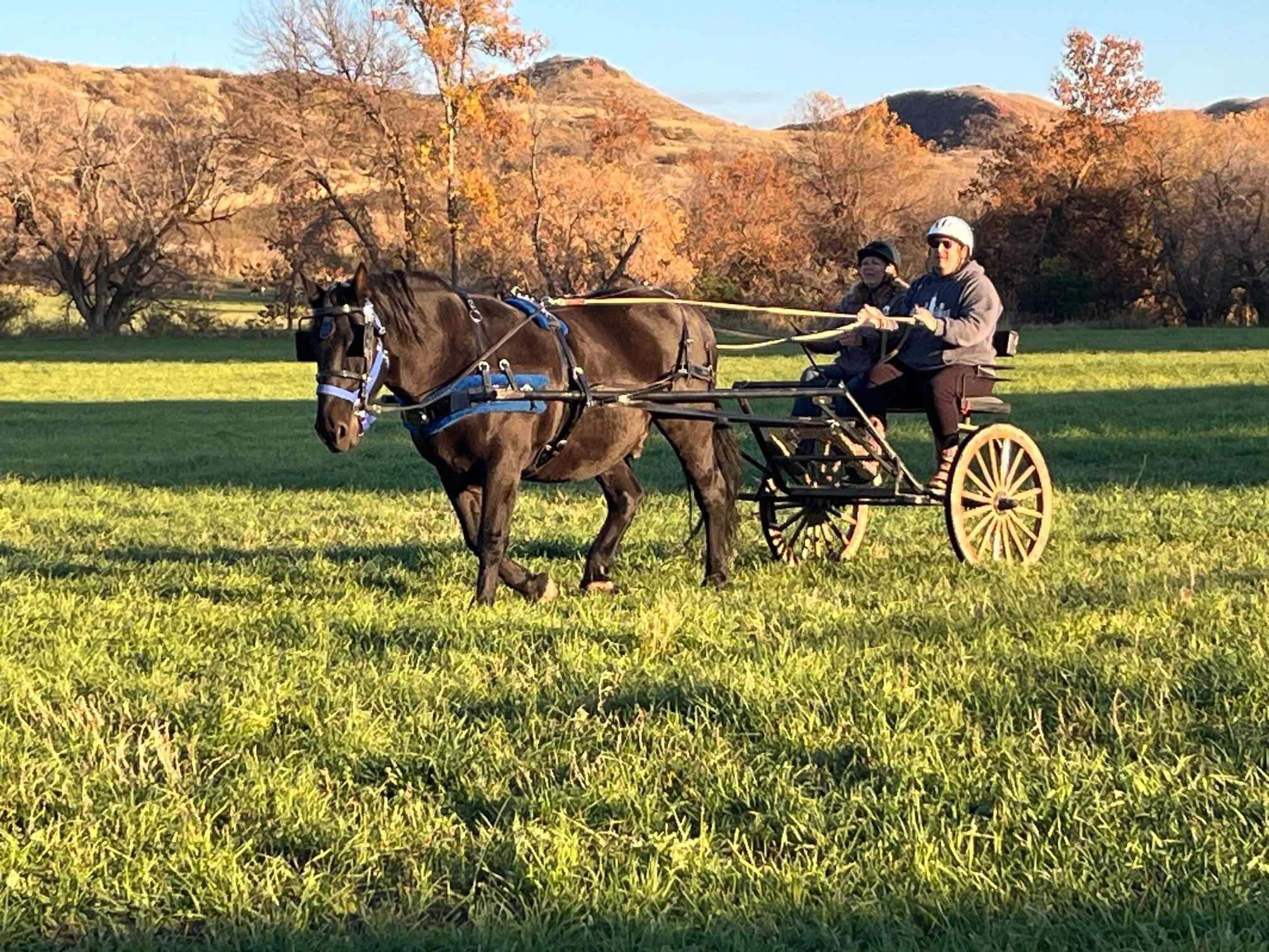 Therapeutic driving is an alternative to riding for people who are not physically able to sit astride, afraid of riding, or exceed our horses' weight limits. Driving focuses on core and upper body strength, spatial awareness and cognitive learning as well as fine & gross motor skills.